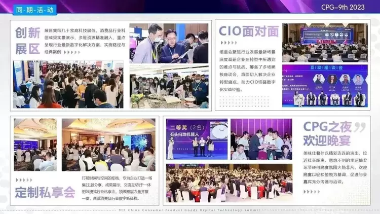 CPG 2023第九届中国消费品数字科技峰会同期将举行创新展区、CIO面对面、定制私享会、“CPG之夜”欢迎晚宴等。