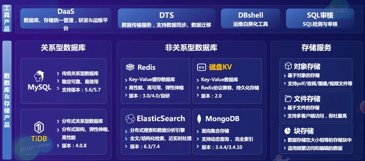 ·最底层是支撑、管理所有数据库的工具产品,包含数据存储服务、关系型数据库、NoSQL 数据库,以及生态工具;