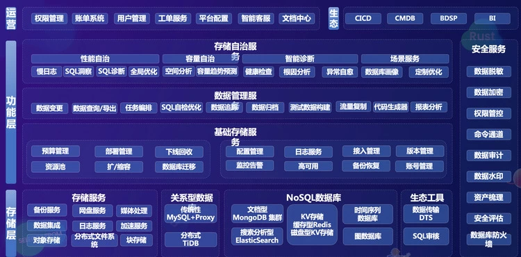 ·最上面是运营层,包括权限账单、用户管理、工单服务等基础服务。同时还有一些安全相关服务,如数据脱敏、数据加密、权限管控、命令通道、数据审计等一系列功能。