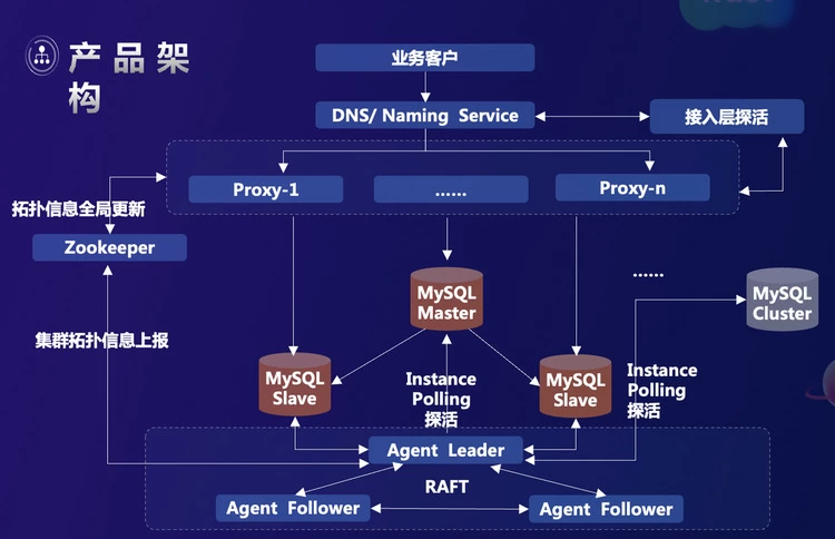 此前,vivo 已经用了很多年关系型数据库 MySQL。基于原生的 MySQL 数据库,vivo 结合集群高可用的管理与数据库代理的一体化架构,通过域名服务、名字服务进行接入,提供通用的关系型数据库服务。它主要具有三大核心能力:
