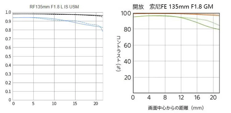 在实测之前我们先看一下RF135mm F1.8 L IS USM的纸面实力,与FE 135mm F1.8 GM对比官方MTF曲线,大致了解理论性能: