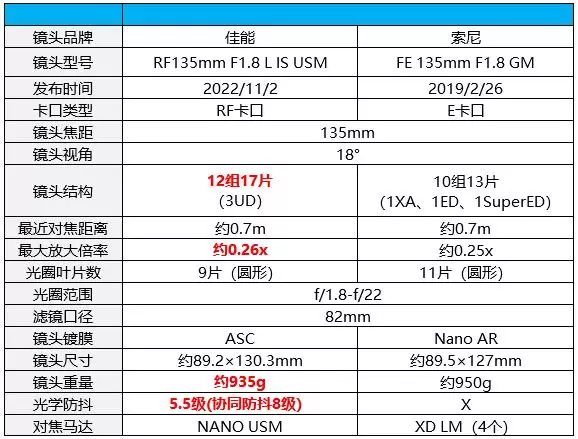 那么RF135mm F1.8 L IS USM与FE 135mm F1.8 GM相比又有什么亮点?下面笔者先来对比一下两款135mm F1.8镜头在纸面参数上有什么差异: