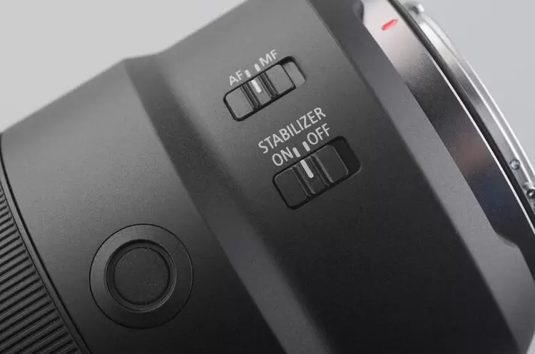 镜头后部的一侧设有AF-MF切换开关和IS防抖开关。这款镜头具备5.5级光学防抖,如果与具备机身防抖的EOS R系列机型搭配使用时,镜头光学防抖还可与机身防抖联动,实现最高8级强抖动补偿效果。