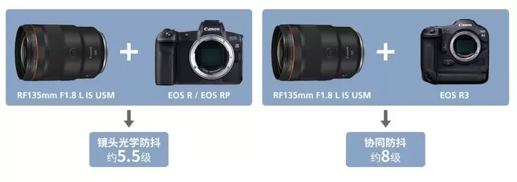 RF135mm F1.8 L IS USM镜头具备5.5级光学防抖,如果与具备机身防抖的EOS R系列机型搭配使用时,镜头光学防抖还可与机身防抖联动,实现最高8级强力手抖动补偿效果。