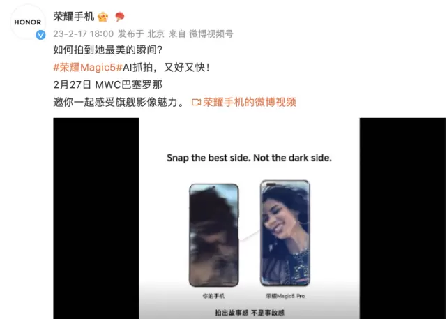 视频中,两部手机同时抓拍一名随着音乐在街头自由舞动的模特,其中荣耀Magic5 Pro一键即可抓拍到模特最美一面,笑容灿烂且面容清晰自然,另一部手机则连按快门拍了十多张,也没能捕捉到模特正脸,不是一片模糊就是角度诡异。而通过视频文案“拍出故事感而不是事故感”以及微博配文“AI抓拍,又好又快”,可以推出,荣耀Magic5系列或将在人像动态抓拍上有重要突破。