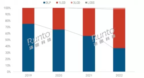 近日,根据洛图科技《中国智能投影零售市场月度追踪》报告显示, 2022年, LCD产品凭借亲民价格与优秀的配置愈发受到年轻消费群体的喜爱,市场份额达到63%,DLP份额则降至37%,预估2023年LCD份额将占超70%以上份额。