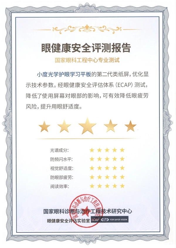 当前市场上,墨水屏、类纸屏、散射屏等多种护眼技术革新推动着屏幕护眼体验的提升。其中,“类纸屏”因能呈现出类似纸张的显示效果,营造更加舒适的观感,受到了广大消费者的喜爱。目前,类纸技术现已发展至第二代,该技术由小度创新研发,已应用于小度光学护眼学习平板。
