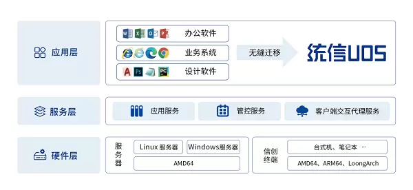 作为架构统信UOS与海量Windows应用的桥梁,统信应用全栈系统支持 AMD64、ARM64、LoongArch三种终端架构,为客户提供一致的使用、体验和管理服务,并具备以下主要功能: