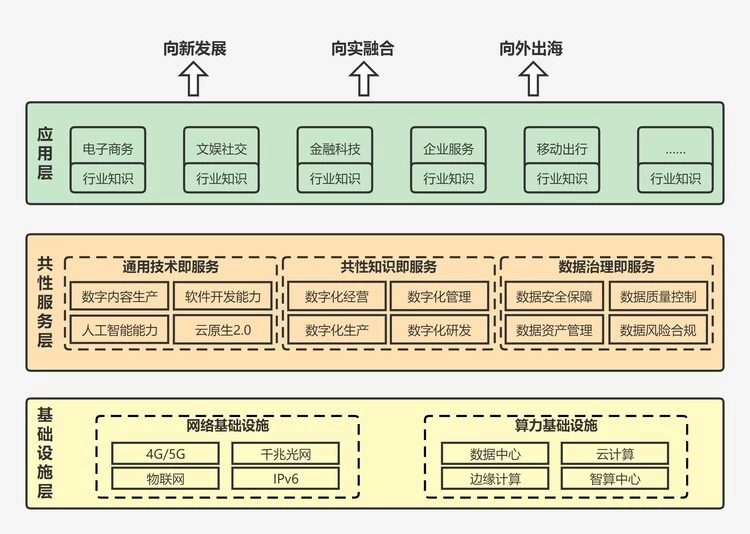 随着互联网应用不断丰富,以及用户需求与产品供给之间频繁互动反馈,以数字内容、软件开发能力、AI能力、数据治理为代表的共性技术,通过技术服务构成数字能力,以应对更复杂的技术需求。而企业的这类需求得以被标准化、规模化和基础设施化部署技术能力满足,从而降低了互联网创新发展的门槛。