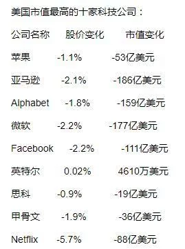 据外媒报道,在今年带领美国证券市场不断创出历史新高之后,美国科技股在周一遭遇重挫,其中市值排名前十位的美国科技公司在当日市值合计蒸发了827亿美元。