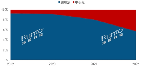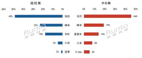 激光投影已经初具规模并且依旧保持较高的增长,在供应链国产化、产品结构调整的战略背景下,终端价格也成为领跑市场的主要因素,市场均价持续下行,进而刺激了消费者的购买欲望,也推动了其在家用场景的渗透。尤其是中长焦激光投影产品,从2019年的1.76万元降至0.65万元,全年出货量也达到18.6万台,同比增长181%。Vidda、坚果、当贝等品牌成为激光投影领域的主力军。