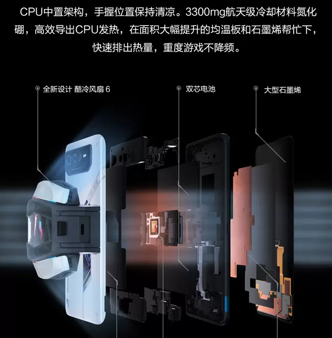 性能释放与散热表现息息相关,为此,ROG6采用了矩阵式液冷散热架构6.0,拥有双石墨烯+真空腔均温板+3300mg航天级冷却材料氮化硼,三种导热材质组合可高效导出内部热量,保持性能稳定释放,即使长时间重度游戏亦可实现流畅运行。其沿用SoC中置架构,手持部位远离核心发热源,持久作战也能获得良好手感!