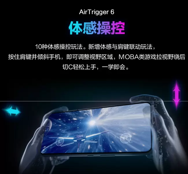 ROG6拥有AirTriggers 6操控系统,配合机身侧边的2×3超声波肩键可实现单点、连点等多种操作手势,解锁大神同款“多指操作”,秀出满分实力;体感操控玩法可通过陀螺仪自动调整重心,在《QQ飞车》《跑跑卡丁车》中为玩家带来沉浸式竞速体验,配合超声波肩键可轻松调整视野范围,在MOBA类游戏中精准定位敌方,一击制胜!