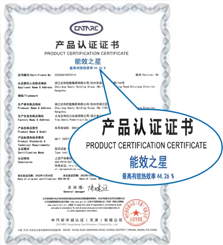 作为新一代雷神电混的拳头产品,BHE15 Plus的有效热效率44.26%也获得了权威机构中汽研华诚认证授予的“能效之星”称号,同时这也是目前量产混动专用发动机的最高热效率,技术先进性处于行业领先水平。