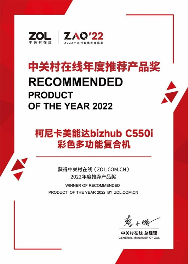 柯尼卡美能达bizhub C550i斩获中关村在线“2022年度推荐产品奖”