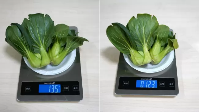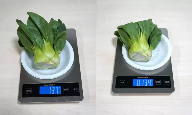 随后我们针对冰箱控制失水率的效果进行了测试,过程比较简单,我们选取两份重量相近的青菜,分别放在冰箱蔬果鲜储区和常温环境中,经过3天的静置,可以看到冰箱蔬果鲜储区的青菜重量从137g略微下降至134g,外观与色泽基本保持翠绿的状态,触摸时能够感受到饱满的汁液感。