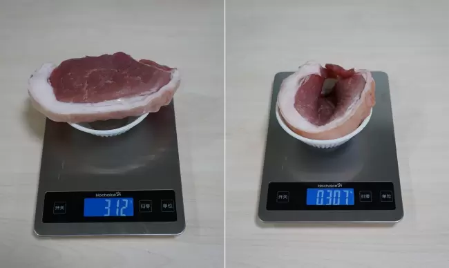 蔬菜保鲜效果优秀,这款冰箱对肉类食材的储鲜也相当优秀,类似的,我们将两份重量相近的猪肉分别放在WILL生鲜空间和常温环境,经过3天的静置,生鲜空间中的猪肉重量从312g略微下降至307g,其表面依然呈现鲜红色彩,肉质柔软弹性十足,同时完全没有腐臭味道产生,保存得相当完好。