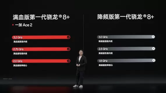 而对于无法达到此种层次合作关系的厂商来说,“满血版”则成为了拉拢消费者的宣传口号。一加在Ace2机型的发布会上表示,其产品所采用的满血版第一代骁龙8+拥有3.2GHz满血版超级内核、2.75GHz满血版性能内核与2.0GHz满血版效率核心,均比其所对标的友商拥有更强的性能表现。