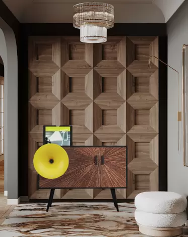 “Kresling专业级柜式留声机”严格遵循国际RIAA标准,采用现代驱动芯片频响曲线调制技术,准确还原声音曲线;科学布局号角,两分频设计使得相位同步更准确,声音结象更清晰;专业级黑胶系统、三点悬吊避震系统等专利的加持稳固了新一代柜式留声机的技术基础。除却本身的音乐属性之外,“Kresling”还自带大容量黑胶储藏等实用功能,既可在播放音乐的过程中充当书面案桌,亦可以玄关桌的身份出现,能出色并轻松地融入家居环境之中,使空间油然而生一抹艺术的色彩。