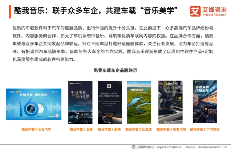 可以说,酷我音乐的用户运营经验和优质资源是车企十分看重的“外力”。最直接的例子就是酷我音乐在与一众车企合作中,根据品牌调性与用户需求的深度定制。例如蔚来品牌全系车型搭载的NIO沉浸声黑胶音乐专区、5.1环绕声专区等,均由酷我车载声音实验室提供;通用汽车的“随心听”车载音乐和比亚迪汉车型的车机皮肤、无损音乐等权益也均为酷我音乐定制化开发,不仅成为打造高规格音乐座舱体验的关键之一,同时也赋能车企的品牌营销和用户运营,最终实现酷我音乐、车企和用户的共赢。