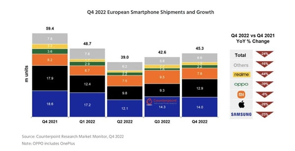 2022年第4季度,苹果在欧洲市场出货量同比下降28%;三星同比下降25%;小米同比下降6%;OPPO(包括一加)同比下降39%;realme 同比下降44%。