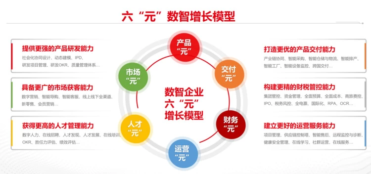借用元宇宙的概念,我们可以将用友六"元"数智增长模型理解为一个基于数智化技术和场景化应用的虚拟世界,该世界包括产品、交付、市场、财务、人才和运营六个领域,并以数智化的形式展现和管理企业的运营和发展。