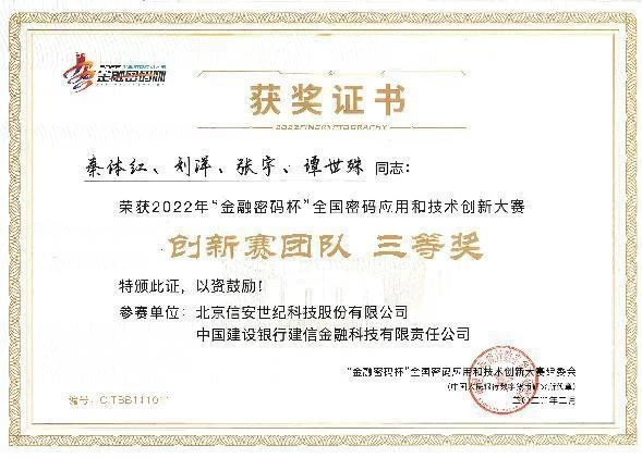 近日,2022年“金融密码杯”全国密码应用和技术创新大赛颁奖大会在苏州成功举办,北京信安世纪科技股份有限公司(股票代码:688201)(以下简称:信安世纪)提交的“白盒SM4算法”荣获创新赛道三等奖。
