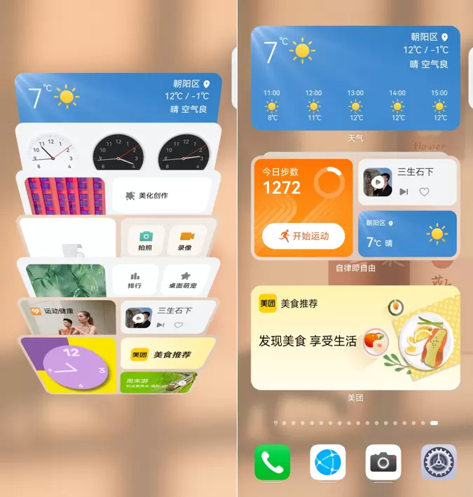 另外,不同尺寸的卡片、系统按钮、快捷方式也能相互组合,比如将运动健康、天气和音乐卡片组合在一起后,我在户外跑步时就可以一边听歌一边查看步数,同时还能关注天气实时变化,所有服务一步直达,桌面易用性玩出新高度。