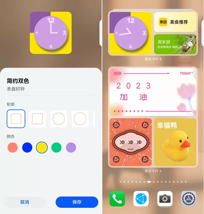智能桌面布局可以一键切换不同风格的桌面,但是如果想要更细致的设置卡片,那就不能错过玩法多样的百变卡片。目前,系统提供了表盘时钟、相框、签名、重要日、小工具等卡片样式,我可以根据自己的喜好定制卡片,比如设置表盘轮廓,给相框添加图片,编辑签名卡片文字或更改颜色等,轻松打造出好看又不失个性的专属化桌面。