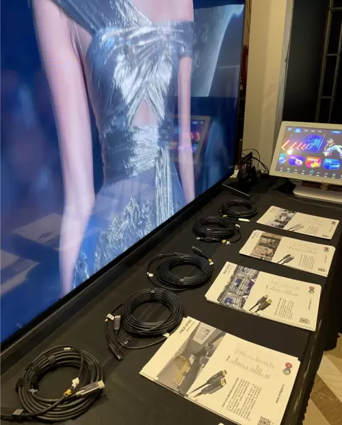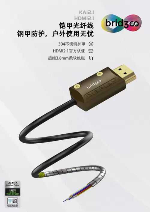 现场展出的bridgee 桥界KAI2.1钢甲HDMI2.1光纤线,具有超高传输速率和坚固耐用双重特点,是桥界的重点产品。产品采用304不锈钢护甲,有效抵御老鼠啃咬、踩踏、枪钉误伤等多种危险,为家用影音布线提供最安全可靠的保障。