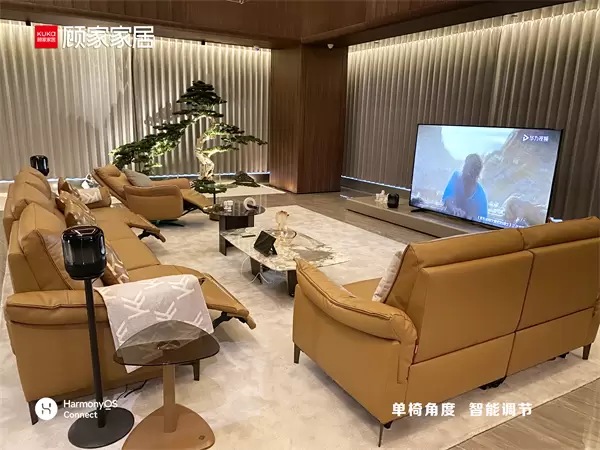 该实验基地项目共三层,涵盖展示区域、实验室区域和公共区域。在由顾家家居提供家具的展示区域中,顾家家居选择智能沙发、智能单椅、智能床等不同的产品,通过不同空间的生活化场景,来展示智能家居未来。如在客餐厅展示区,顾家家居通过真皮材质的空间产品与电动功能的结合,以及空间整体高级灰色调的定制套系产品,打造出一个意式优雅风的空间,空间中的功能类沙发、单椅、智能床等在接入鸿蒙生态之后,也将实现全屋多设备联动场景,带来智能化交互体验。比如用户需要一个深睡环境,只要在手机或语音设置睡眠模式,空间内灯光、床垫、窗帘将自动联动营造睡前氛围,一键进入助眠状态,待进入睡眠状态后,还能持续感知睡眠状态及身体状况,以实时调整睡眠环境。