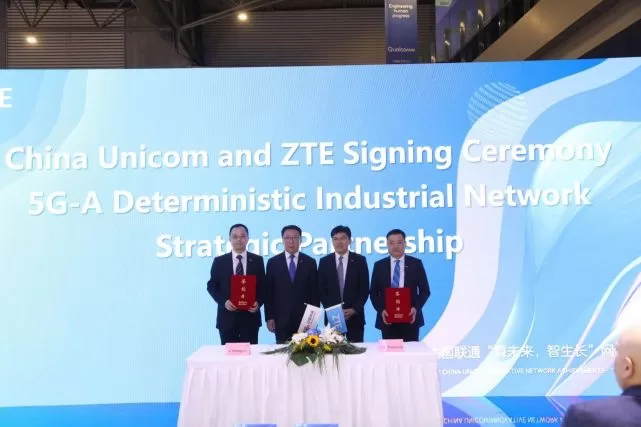 2022年,中国联通联合中兴通讯,在安徽美的厨热芜湖基地开展基于5G-A确定性网络的智能工厂应用试点,实现了业界首例URLLC联合基站算力内置方案和TSN的试验应用验证,验证了部分业务的确定性数据传输服务,大幅提升了工业生产的可靠性和便捷性。发布会最后,在梁宝俊、王喜瑜的共同见证下,中国联通与中兴通讯签署了5G-A确定性工业网络战略合作协议。