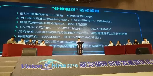 Vision China 2018大会联手Airdoc在今年闭幕式上首次为大家带来了一场人工智能的盛宴。一方是赵明威教授领衔的5位医生专家团队,另外一方是陈峰教授领衔的5位非眼底专业的年轻医生+AI团队。同时,台下的数百医生也被随机分配到专家队和AI队,瞿佳、唐仕波、刘江、刘铁瑛、金熙作为活动评委。