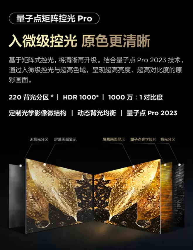 在之后时间里,电视行业推出了一系列的显示技术,但基本都是基于LED之上,而TCL在2023年年初发售的TCL C11G运用了大量全新的显示技术,堪称LED的再次进化,这就是量子点矩阵控光Pro技术。