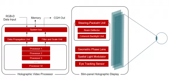 WIMI微美全息超薄面板全息显示系统,包含转向背光单元(S-BLU,Steering-backlight unit),它由相干BLU和一个光束偏转器(BD)组成。通过使用S-BLU,将SBP(Spatial Bandwidth Product)提高数倍。所有光学元件均采用超薄结构设计和制造。通过专用全息数字影像处理通过单芯片FPGA处理器实现8K超高清全息图。光学架构由光束偏转器、相干背光单元、几何相位透镜和空间光调制器组成。使用波导的相干背光单元配置:红光和绿光的第一波导和蓝光的第二波导堆叠在一起,以提高整体效率。