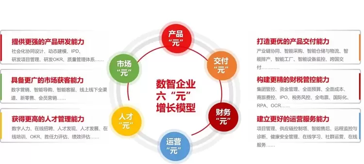 六"元"增长模型是一个全新的数智化企业管理与经营模型,旨在帮助成长型企业从最关键的六个方面提升研发能力、交付能力、市场获客能力、财税管控能力、人才管理能力和运营服务能力,这些能力是建立在应用各种数智技术支撑的新场景下,为企业带来经营管理的场景革命。