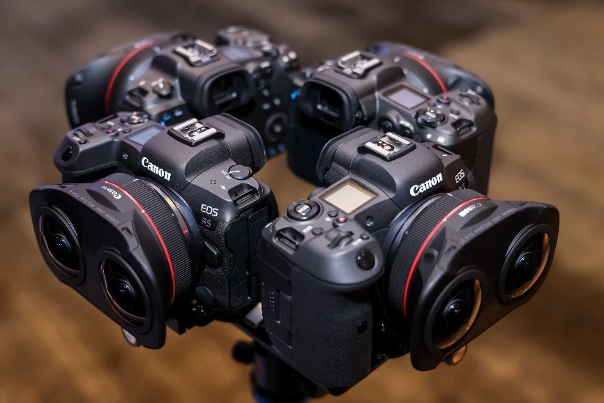在XR产业迎来新的发展阶段之时,佳能进一步开拓全方位多场景的VR市场,正式展出了3D 360°VR 拍摄解决方案。该方案由4个EOS R5/R5C机身和VR双鱼眼镜头套件组合而成,支持拍摄360° 全景VR视频,吸引了众多从业者的关注与交流。
