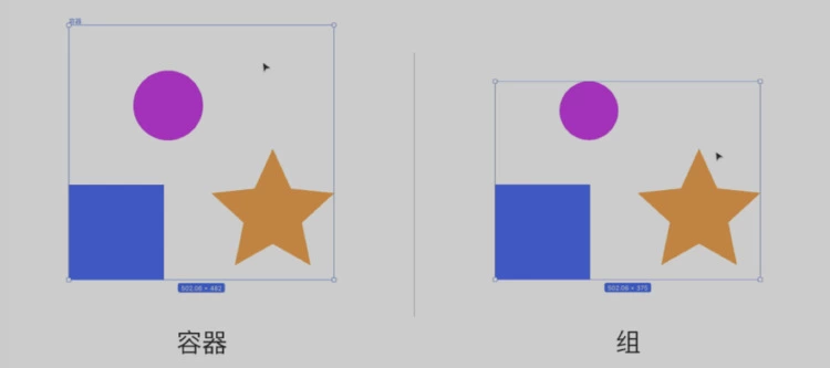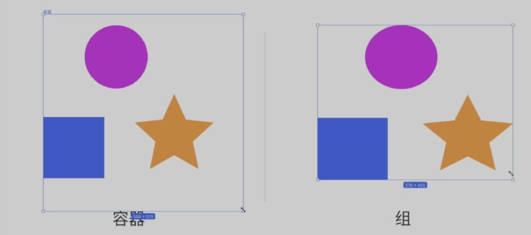 「容器」的边界大小独立于子元素。而「组」的边界大小与其子元素相关。因此,应用于以下具体场景中,他们的表现也不相同。