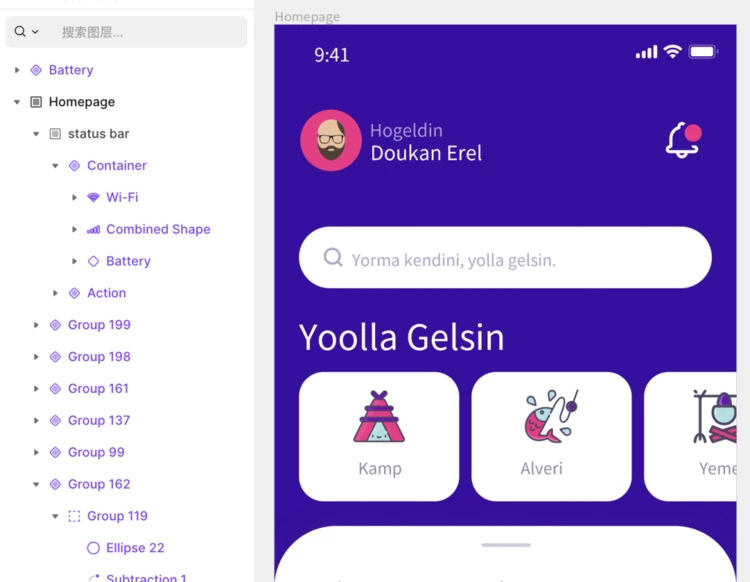 如下图,通过多级容器嵌套让图层的结构与视觉上的模块基本保持一致(组件和自动布局元素也是容器,只不过是特殊的容器)。这样做不仅可以让我们的设计稿更容易维护,也会潜移默化地影响我们的设计思路,让我们在思考设计时更加有条理有逻辑。