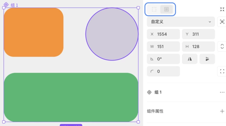 而当你希望出现以下情况时,我们建议使用「组」来承载子元素进行创作。比如,将多个元素组合到一起,但不影响他们的可编辑性;将多个元素组合在一起,以便在缩放时保持跟随缩放(例如:由多个形状组成的logo或符号);在操作组的边界大小时可以使子元素自动适应等等。