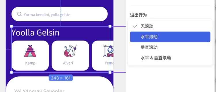 MasterGo 中的容器与 HTML 中的容器有异曲同工之处。在 HTML 中,容器可以设置内部滚动,而我们同样可以为「容器」设置内部滚动。比如下图中的推荐模块,设置容器水平方向溢出滚动行为后,原型演示模式下就可以实现容器内的子元素按水平方向滚动的效果了。