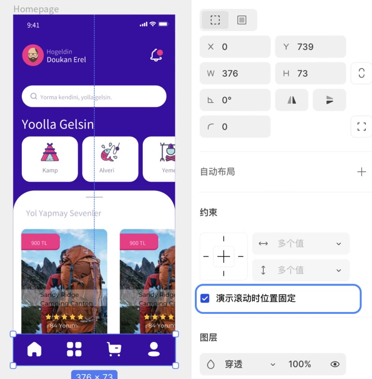 为容器设置了溢出滚动行为后,若某些元素需要固定在容器的特定位置,比如 App 的底栏,我们可以勾选该元素的「演示滚动时位置固定」,这样在原型演示模式下,滚动内容时它的位置不会跟随变动。