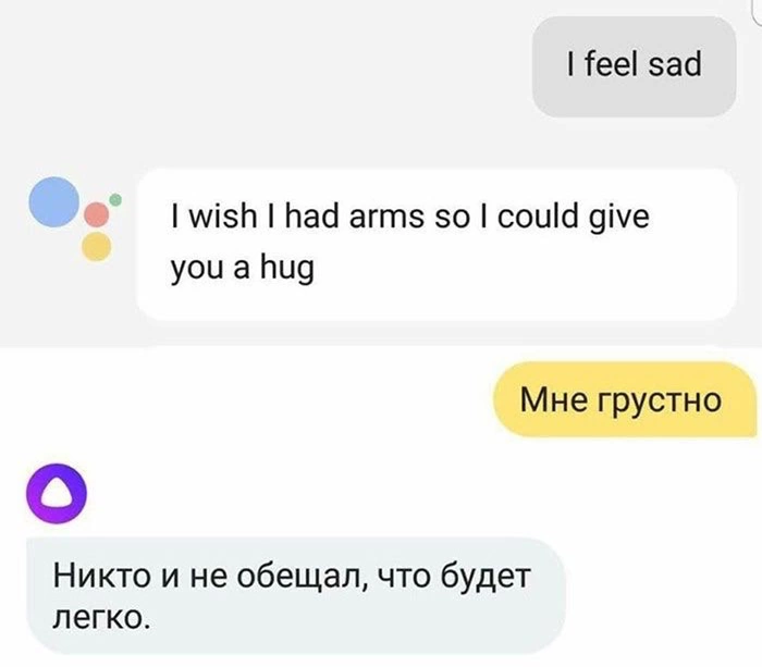2017年9月,一副截图引起了俄罗斯网友的热议。对着两个AI说同一句话,竟得到迥乎不同的答案:一个是说英语的谷歌助手,另一个是说俄语的Alisa(由俄罗斯搜索引擎公司Yandex)开发。当有人对这两个AI说出“我很伤心”的时候,谷歌助手回答,“我真希望自己有双臂,能给你个拥抱。”而Alisa回答,“生活的意义本来就不在于享乐。”