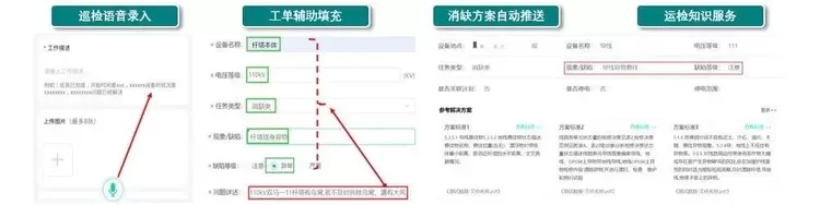 在这个场景中,云知声实现了四个智能化应用,包括巡检语音录入,工单辅助填充,消缺方案自助推动和运检知识服务。