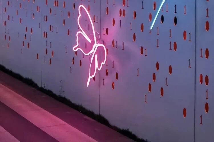 往前探索,悬浮于空中上空的3D立体广告视频,多维度展示着品牌信息及最新款产品。走到后街区,镶嵌在两侧墙上的蝴蝶模型,瞬间“复活”翩翩起飞,环绕消费者身边,这时只需伸手向前,远方的蝴蝶将飞来,缓缓停落在指尖。