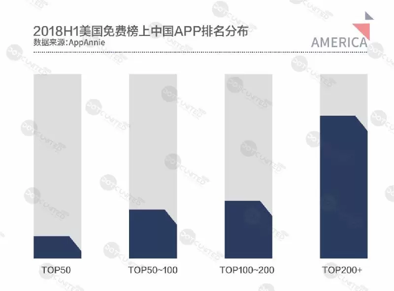 据AppAnnie统计结果来看,对于活跃在美国免费榜上的来自中国的约60款APP,位于TOP50的约5款左右,TOP100内的不到20款左右,近一半的中国APP都排在了200名之外。