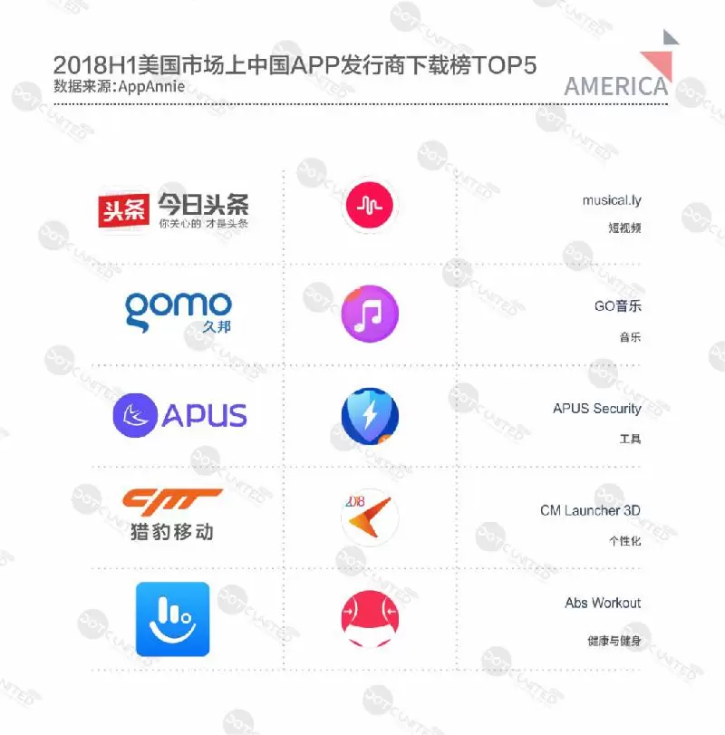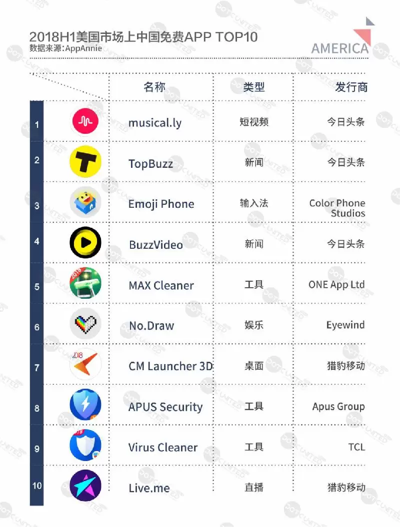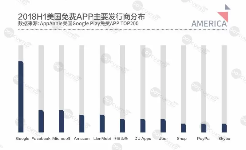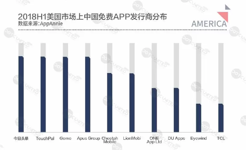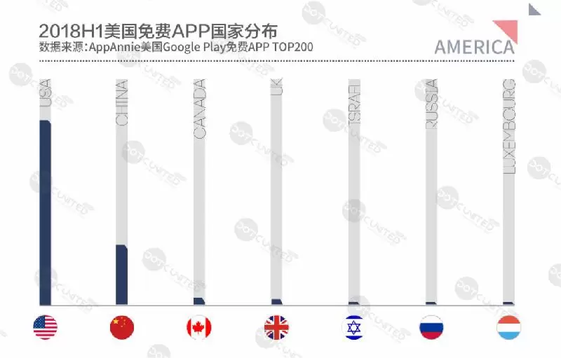 中国是美国APP市场最大输入国,目前,就APP发行数量而言,在美国Google Play TOP200免费榜APP中,来自中国的产品主要集中在LionMobi、今日头条和DU Apps等超过20家厂商,中国的很多APP产品都已得到美国用户的支持和信赖,中国制造,再接再厉。