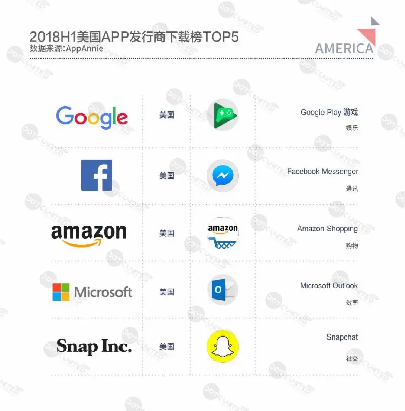 统计美国Google Play TOP200免费榜APP结果显示,有超过一半的APP都来自美国本土,产品主要来自以美国科技巨头Google、Facebook、Microsoft、Apple、Amazon等为首的共计近80家公司,产品主要涉及购物、金融、社交和通讯等近20个品类。