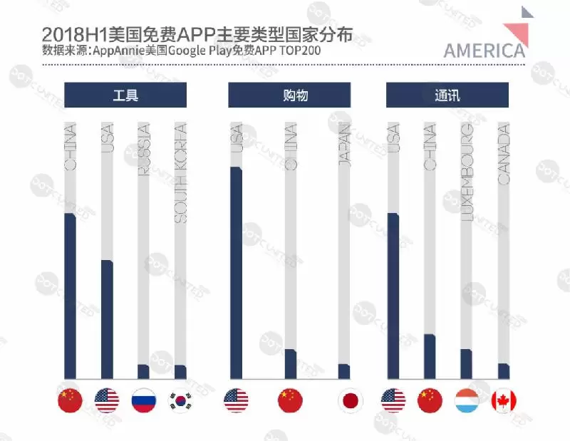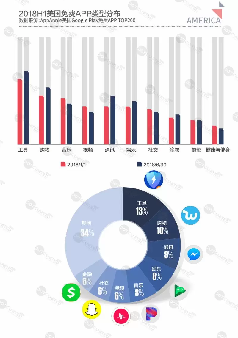 美国2018年上半年免费APP类型基本可以锁定在工具、购物,通讯等主要品类。