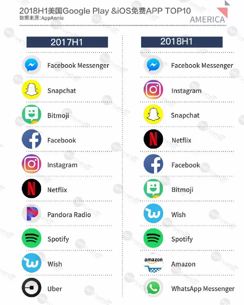 纵观美国2017、2018年上半年APP免费榜单,Facebook旗下通讯产品Facebookmessenger风采依旧,蝉联榜首。有数据显示,Facebookmessenger在美国的渗透率仅低于社交应用Facebook和视频分享平台YouTube,在美国渗透率高达70%,同时,美国也是Facebookmessenger使用时长最长的国家。